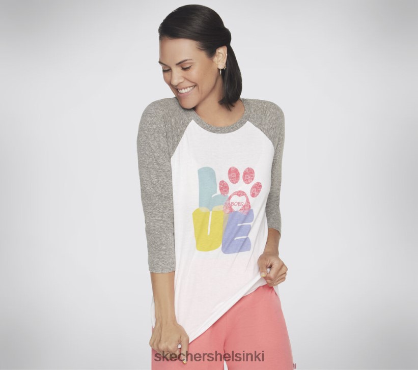 Todellisella rakkauskävelyllä neljässä Skechers Love -pohjaisella bobilla on baseball -tee. Tässä puuvilla-/poly -sekoituksessa 3/4 Ragan Sleeve Tee sisältää edessä sydämen lämmittävä “rakkaus” -grafiikka ja eksklusiivinen bobs for Dogs -logo takaosassa. Jokaisesta bobien ostosta lahjoitetaan apua tarvitseville eläimille.