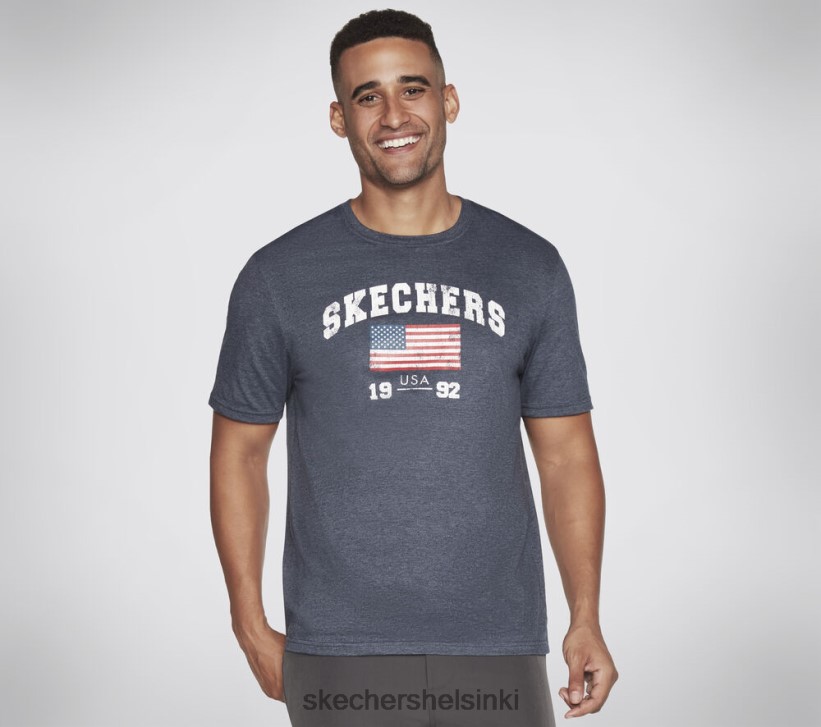 Rock Your American Pride yllään Skechers -lippu -raitapia. Tässä puuvillassa poly -sekoitusryhmän kaula -teeissä on lyhyet hihat, joissa on yksinoikeudella Skechers Heritage -logo ja Amerikan lippugrafiikka.