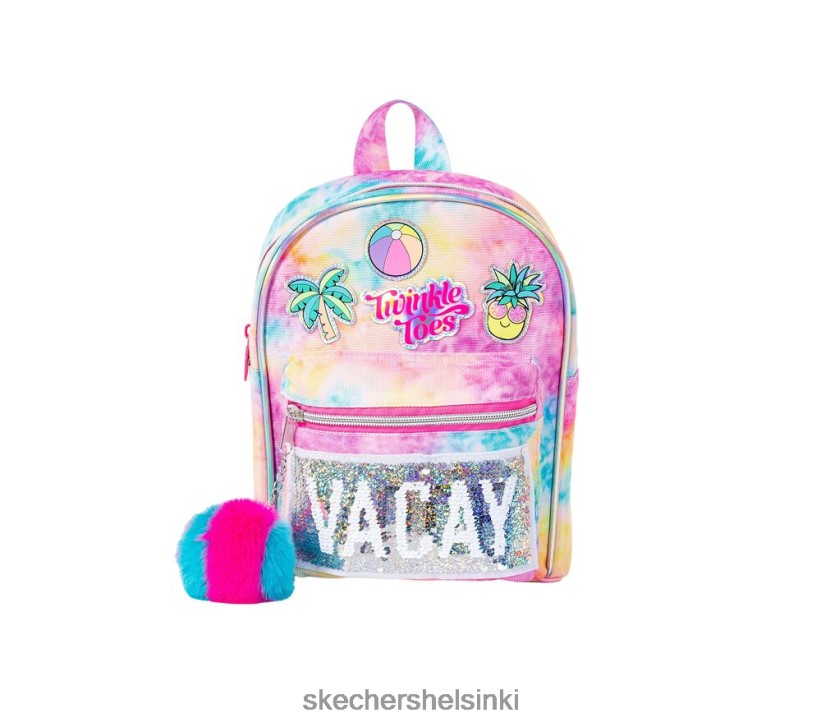 Flippable Sequin Beach -teeman hauska on valmis pakaamaan Skechers-tarvikkeet Twinkle varpaat: solmioväli Flip Sequins mini-reppu. Tässä mini-takaosassa on allover-solmiovärjäyskangas, jossa on palmu- ja rantapallo-applikaatiot, flippable-paljettipaneelin yksityiskohtaiset yksityiskohdat ja pop-pom-viehätys etuosan vetoketju.